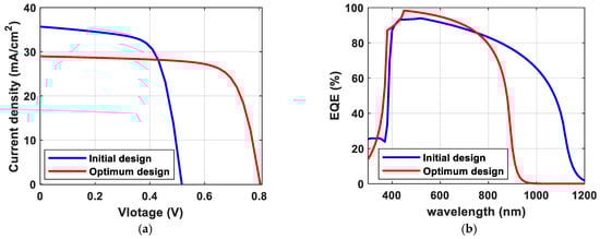 2, a FF of 73.72%, and a PCE of 17.16%. The JV and EQE curves of the initial and optimum cells are illustrated in