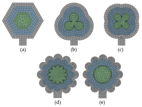 Mesh in the models. (a) Hexagonal; (b) 3L Clover (c) 4L Clover; (d) Flower; (e) Internal circular section with a flower shape in the external profile.