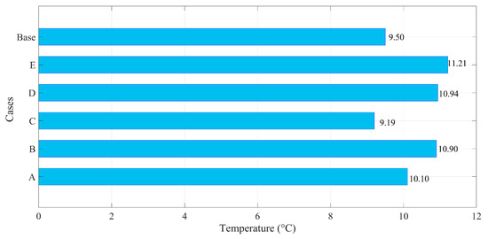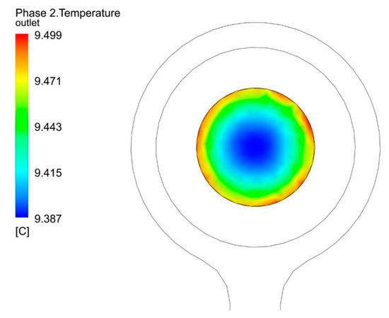 The base case outlet temperature obtained in the CFD analysis considers the value in the centre zone of the circular pipe, as can be appreciated from Figure 3, with the maximum values in the zone near the wall being 9.5 °C.