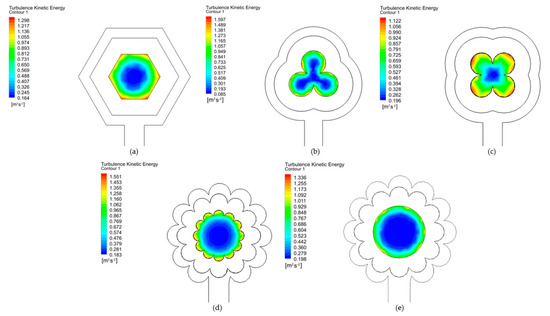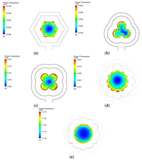 Through a comparative analysis, it was determined that an increase in the heat transfer to the working fluid can be noticed in the outlet temperature in the models of profiles with shapes of hexagon, 3L Clover, 4L Clover, flower, and flower in the external profile, in the cross section. with The results are presented in Figure 4a–e.