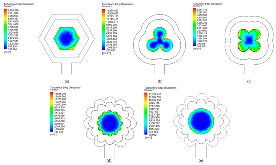 Figure 5 shows the kinetic energy turbulence at the outlet for each model presented, highlighting a more comprehensive range for the 3L Clover model, which has a maximum value of 1.597 m2s·−2 and a minimum value of 0.085 m2·s−2. Likewise, the Turbulence Eddy Dissipation is considered in the output of the models. In that case, it can be seen that the maximum value (15,378.532 m2·s−3) is presented in the 3L Clover model. In contrast, the final model, with the internal circular section with a flower shape in the external profile, presents the minimum value (78.962 m2·s−3), as shown in Figure 6.