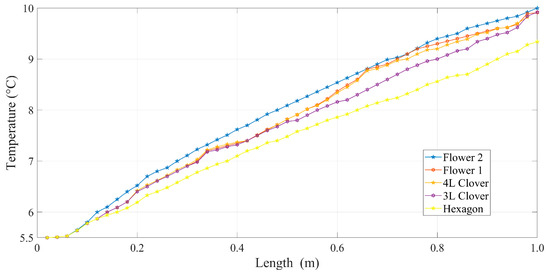 The third configuration under study, presented in Figure 4c, is a four-leaf clover, where the maximum surface temperature is 12.76 °C, while the average temperature of the refrigerant is 9.12 °C. Figure 4d displays the fourth configuration to be analysed, the 11-petal flower. For this shape, the working fluid temperature ranges between 10.83 and 10.94 °C, while the surface temperature reaches a maximum of 13.51 °C. This temperature is 3.92% and 5.89% higher than the surface temperatures reached with the hexagon and four-leaf clover configurations, respectively. This analysis considers that the configurations that present curves in the geometry improve the heat transfer to R600a.