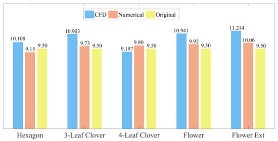 - The increase in heat flow to the working fluid, refrigerant R600a, can be measured by the change in refrigerant temperature. When comparing the proposed cases, where outlet temperatures of 10.10, 10.90, 9.19, 10.94, and 11.21 °C were obtained in the models with a hexagon, three-leaf clover, four-leaf clover, eleven-petal flower, and circular profile with flower surface shape, respectively. With the experimental value of 9.5 °C, a temperature increase of 18.04% was generated concerning the experimental case, validating an improvement for the heat transfer device.