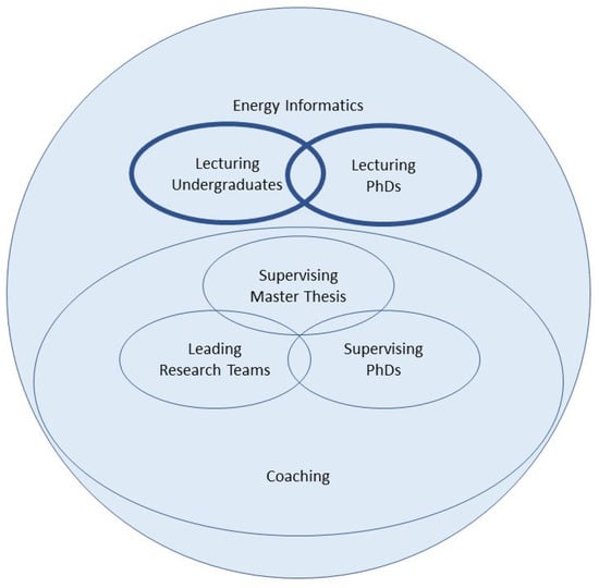 Figure 1 summarizes the main pedagogical dimensions that can be identified within the energy informatics domain. As an interdisciplinary domain, energy informatics comprehends a wide variety of subjects among mathematics, economics, engineering, computer science, and power systems as further elaborated in []. Here, smart energy and power systems modelling is identified as a key subject lying at the heart of the energy informatics domain and creates strategic links between the other subjects. As such, there is a need to teach both fundamental and more advanced specialized subjects in order to educate future energy informatics specialists [] that will be able to address the sustainability needs [] of modern society using holistic and interdisciplinary socio-techno-economic approaches. Education should cover subjects at different levels, from introductory courses at the Master’s level to more advanced courses at PhD level. This motivates and explains the two key dimensions of lecturing undergraduates and lecturing PhDs that are shown in Figure 1. Another important pedagogical dimension that is strictly connected to teaching is supervision at both Master’s level and PhD level. In both cases, the objective is to work on wider projects with some degree of novelty for Master’s students, and with full research content for PhD candidates. Novelty is intrinsic in research, therefore a Master’s level thesis can be considered as smaller sub-projects of wider research projects that are tackled at PhD level. From this point of view, smart energy and power systems modelling is an advanced subject that offers many research opportunities, as it can be noted by the active scientific community that consistently and continuously works in this field []. At a wider level, the supervision of large groups of Master’s students and PhD candidates requires additional pedagogical skills in terms of team leadership. Therefore, supervision and research teams’ leadership are tightly interconnected as pedagogical dimensions, since they require complementary pedagogical skills, as shown in Figure 1. Broadly speaking, on top of the leadership role and technical competencies required for supervision, coaching skills are also necessary for those managing large groups, to provide more holistic support that goes beyond pure technical knowledge but considers the students and researchers as human beings that need to be motivated and guided throughout their career. That is why the coaching dimension is embracing the other three dimensions of supervision and leadership in Figure 1, to identify the additional set of pedagogical skills that can enhance the quality of the tasks performed within the other dimensions.