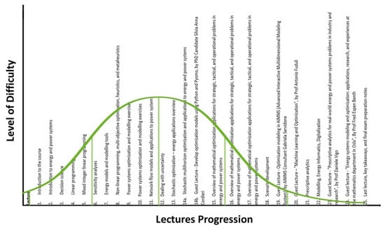 Energy informatics researches ways to more efficiently manage fossil and renewable energy resources using information and communication technology. Smart (power) grids, smart meters, demand response, smart buildings, plug-in electric vehicles, energy storage, energy policy, energy markets, and market mechanisms, etc. are some of the issues covered by energy informatics []. As discussed in [], energy informatics is a broad domain that is neither about being an expert in power/energy systems nor about being an expert in computer science. It is more about developing connections between sectors. Most importantly, energy informatics is an interdisciplinary field; hence, a relevant course should cover issues that connect and integrate the two key subjects of energy and informatics. The main opportunity behind this domain is to create connections between different fields, enhance skills and allow research tasks that would not be possible without interdisciplinary knowledge. The main challenge is that students coming from different study programs will always be weaker on one side or the other. For instance, computer science students will need to pick up some broad energy and power systems knowledge, while students coming from energy-related study programs, might have to pick up and reinforce some computer science knowledge, with particular regard to programming skills. The teaching approach should therefore provide the right tools to tackle Energy “and” Informatics topics in a holistic, high-level way, that is approachable to students with different backgrounds.