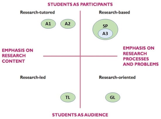 The new tasks P are shown in light blue. The opportunity to present the work to their peers would put the students both as participants (when they are giving a presentation to their peers) and as an audience (when they are attending the presentation of their peers). This is the reason why the new task P is visible in two quadrants simultaneously. Presentation P is an extension of the first assignment A1 when students are delivering it, and it has a high level of student participation as well as a high emphasis on research content due to the intrinsic requirements of assignment A1 that are strictly connected to existing scientific research papers. This explains the position of task P in the research-tutored quadrant, embedded in task A1 of Figure 10. The presentation P puts also students as the audience, while still maintaining a high emphasis on research content. This explains the simultaneous position of task P in the second research-led quadrant.