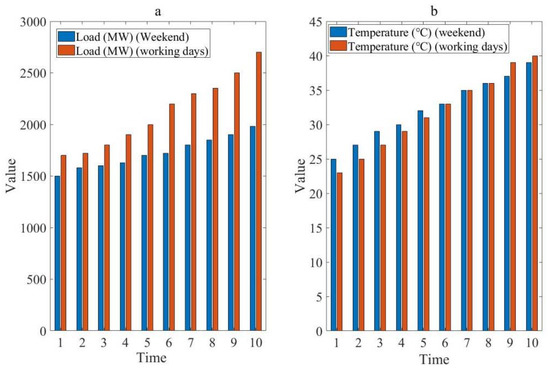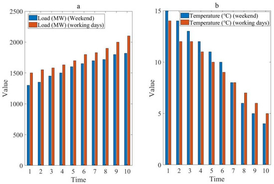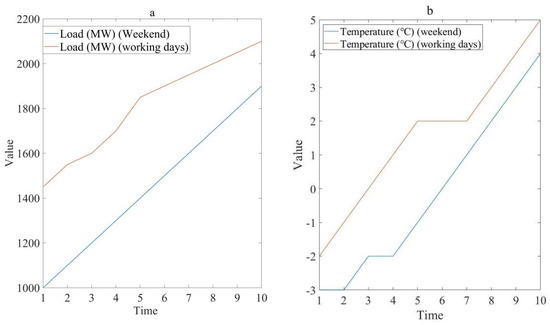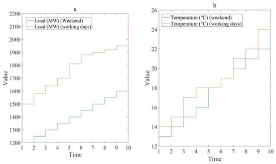 From Figure 5a, it can be seen that the load of the PS is constantly increasing during weekends off time or during working hours. At 10 o’clock, both reached their maximum values, which were 1820 MW and 2100 MW, respectively. This was because in winter, when the temperature was low, the load value of the PS increased with the increase of use of heating appliances. The reason for high values for workdays was due to a large amount of machinery and equipment operating during the workday. From Figure 5b, it can be seen that, combined with the load of the PS, as the temperature decreases, the load of the PS gradually increases. This was because the weather was cold and many people used heating equipment, which led to an increase in the load value of the PS.