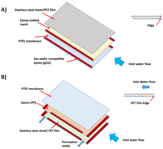 Assembly of the MD system: (A) the evaporation region, which consists of a sheet of epoxy coated fine mesh (or the water diversion cloth) as the spacer, and (B) the condensation region, which consists of a polypropylene (PP) mesh as the spacer. Both regions are separated by a porous hydrophobic (PTFE) membrane. (A,B) share the same PTFE membrane and laminated to form a complete “layer” of the membrane distillation unit. A multilayered MD system contains up to 5 A/B layers.