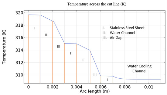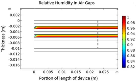 Figure 6 shows the relative humidity distributions in the air gap as well as in the porous membrane of the two-layered system. In the chosen design, small blocks on the left represent the opening of the air gap, where the condensed water exits. From the simulation, it is seen that the relative humidity reached 100% on the surface of the condensation plate (as shown by the color map in Figure 6). Investigating the relative humidity within the air gap region can allow us to predict if the water vapor is present in the air gap, as well as to understand if the water vapor can condense on the condensation layer. The simulation results indicate that the air gap region of the system had a high humidity, showing the presence of water vapor. The humidity measurements at the surface of the condensation plate exhibited a value about one, which indicated that the water vapor condensed on the surface of the condensation plate. The dashed line indicates the cutting line through the device that allows for the investigation of the arc length. Arc length is the length coordinates along the cutting line (dashed line) that were used in the simulation study. Using this cross-section or cut line allows for the investigation of the temperature loss, as well as vapor pressure differences in the condensation layer of the device.