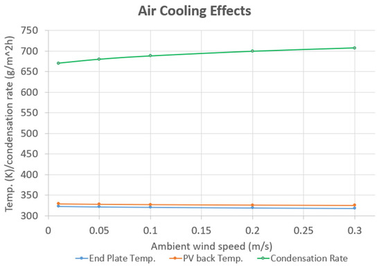 The effect of air flow (wind) speed using the configuration in Figure 9 on the condensation rate of the MD system.