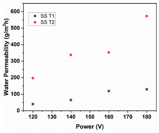 Figure 12 illustrates the pure water production rate as a function of heating pad power for a two-layered MD unit in two separate runs (T1—first run; T2—second run). It was seen that the pure water production rate (water permeability) increased with the increase in heating pad power (120 volts to 180 volts) in the first run. However, in the second run, the water production rate was found to increase quite significantly, although the trend of water permeability increases with the heating power was much more enhanced. The close examination of the system indicated that there was a minor leak, where the task of selecting a proper sealant to assemble the system had become an essential task. There are few possibilities that would cause the system to leak. For example, the epoxy or sealant cannot properly handle the thermal expansion of the different materials, resulting in the failure of sealing around the entry and exit of the feed water. Since this was the initial work, the sealant was not investigated exhaustively. We believe that the thermal expansion caused by heating of the device could form minor cracks between the sealant and the contacting materials, which could explain the minor leak that observed. This conclusion is also consistent with the conductivity results.