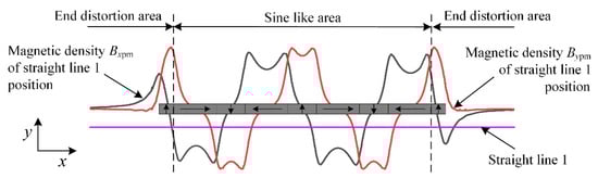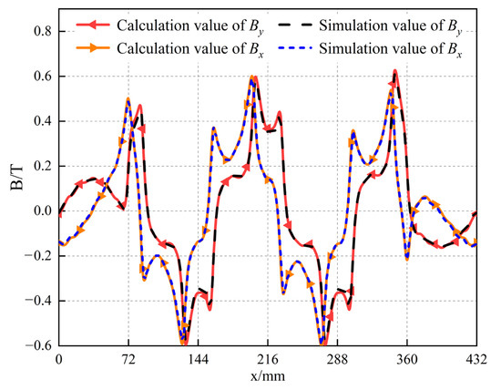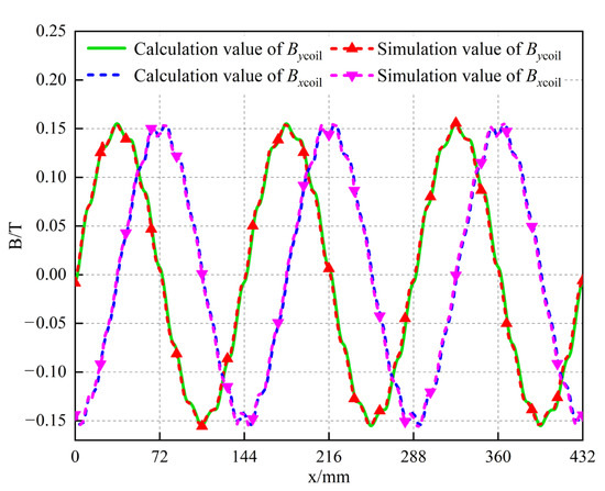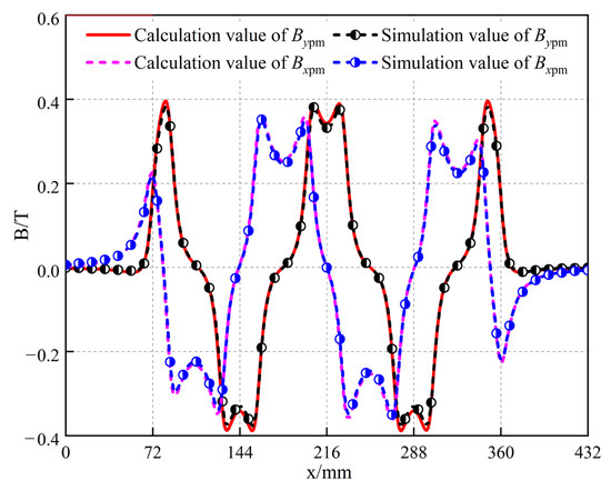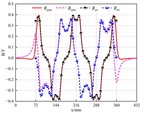 A comparison of the calculated air-gap magnetic field values, Bxpm and Bypm, of the Halbach permanent magnet array when the edge-end effect is considered and the calculated air-gap magnetic field values, Bxn and Byn, of the Halbach permanent magnet array when the edge-end effect is not considered is shown in Figure 7.