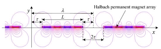 As shown in Figure 2, according to the finite element static field simulation results of the Halbach permanent magnet array, the whole array with length L in the x-direction can be divided into three parts, namely, the sinusoidal-like region and the edge-end distortion region, according to the actual distribution of the magnetic induction intensities Bxpm and Bypm at the position of line one in the air gap. If the pole pitch of the permanent magnet array is τ, the symmetry period of the air-gap magnetic density in the sine-like zone is still 2τ. Still, the air-gap magnetic density in the end distortion zone does not follow this symmetry law. Define ɛ as the distance from the edge of the permanent magnet array when the magnetic field decays to zero. Based on the results of the finite element static magnetic field simulation, it can be approximated as ɛ = τ; i.e., the magnetic fields do not affect each other when the distance between two adjacent permanent magnet arrays is 2ɛ. As shown in Figure 3, assuming that the permanent magnet array is infinitely long in the x-direction, the permanent magnet array after considering the edge-end effect will be symmetrically periodic, which is said to be a mechanical pseudo-period [11]; i.e., λ = L + 2τ.