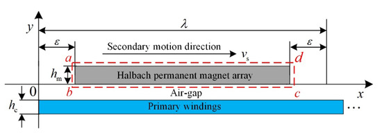 This paper separately solves the IHPMSLM primary and secondary air-gap magnetic fields using magnetic vector potential. To simplify the calculation, the basic assumptions are as follows: (1) There is no change in the magnetic field along the z-direction, and only the directional component of the primary winding current exists. (2) The IHPMSLM extends infinitely along the x-direction. (3) Each permanent magnet in the Halbach permanent magnet array is uniformly magnetized and non-demagnetized. The recovery curve coincides with the demagnetization curve, and the permeability is equal to the air permeability.