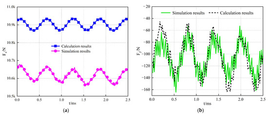 The calculated results of the single-sided IHPMSLM secondary electromagnetic force under the periodical steady-state operation condition obtained from the analytical calculation are compared with the finite element simulation results, Fx is shown in Figure 12a and Fy is shown in Figure 12b.