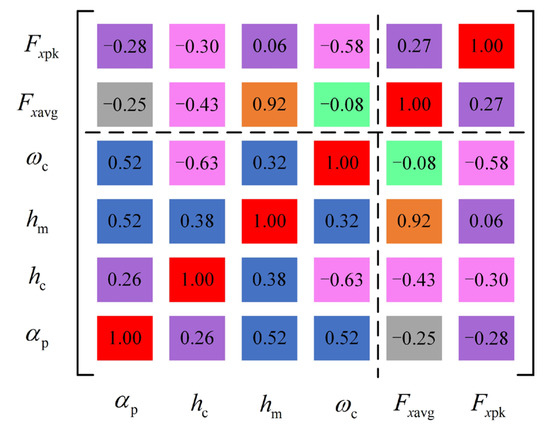 To clarify the parameter sensitivity order and its contribution degree to the resounding optimization results and to determine the critical optimization variables, the correlation matrix of optimization variables in Figure 13 was calculated using a GA. The positive and negative signs of the elements in the figure represent positive and negative correlations, respectively, and the magnitude of the element values directly reflects the strength of the correlation between the parameters.