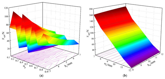 To further verify the parameter sensitivity analysis’s conclusions, draw the optimized variables’ response surfaces as shown in Figure 14 and Figure 15. Where Figure 14a,b show the response surface of the average thrust and Figure 15a,b show the response surfaces of peak to peak thrust fluctuations. The change in the value of αp can significantly affect Fxavg and reaches its maximum around 0.5, while Fxpk fluctuates more with the increase in the value of αp. At the same time, the increase in the value of hm causes a smaller change in Fxpk, but a more significant lift in Fxavg. In addition, the increase in the value of ωc can significantly reduce Fxpk and make Fxavg constant. Finally, Fxavg and Fxpk all decrease significantly with the increase in the value of hc. Therefore, we need to weigh the pros and cons of choosing parameters during optimization.