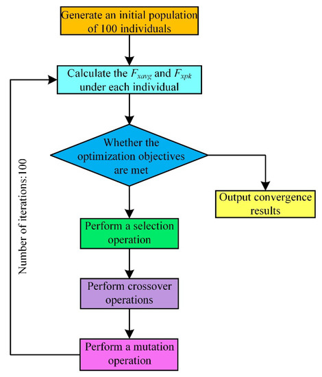 The parameters αp, hm, hc, ωc, and are the critical variables of the IHPMSLM-loaded air-gap magnetic field. Due to the long stroke of the IHPMSLM in this study and the absence of core parts, the primary winding is only supported by the stator skeleton to avoid mechanical friction between moving parts and stationary parts due to force deformation during the non-periodic transient operation of the motor, the mechanical air-gap is still selected to be ẟ = 5 mm constant. Therefore, the parameters αp, hm, hc, and ωc can be used as optimization variables to find the optimal combination of optimization variables, which makes the calculated value of Fxpk not increase and places the maximum calculated value of Fxavg under the constraint that the thickness of theunilateral IHPMSLM is constant, i.e., hm + hc + = 20 mm, using a GA to obtain the best solution for the optimal design of the IHPMSLM. The optimization objective functions are as follows: