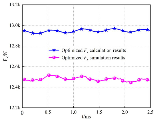 As can be seen from Table 4, the optimized Fxavg calculated value is 18.75% higher, and the Fxpk calculated value is 30.27% lower, than before optimization, while the optimized Fxavg simulated value is 17.46% higher, and the Fxpk simulated value is 28.76% lower, than before optimization. The calculated results are in good agreement with the simulation results. In addition, the optimized unilateral IHPMSLM average thrust is improved significantly, and the thrust fluctuation is reduced significantly, which initially achieves the optimization goal and verifies the application of the GA and the correctness of the optimization results.