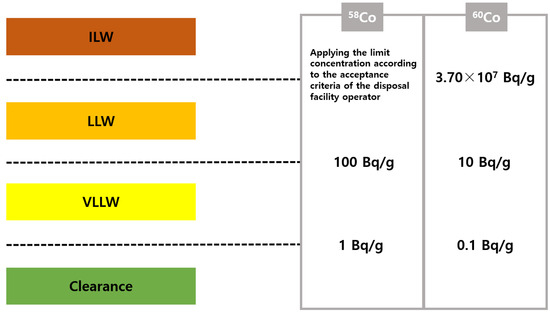 In Korea, the classification and classification criteria for radioactive waste have been legislated by Notice No. 2017-65 of the Nuclear Safety and Security Commission (Regulations on the Classification and Clearance of Radioactive Waste). Depending on the concentration of each radionuclide, the waste is classified into intermediate-level (ILW), low-level (LLW), very low-level (VLLW) radioactive waste, and clearance waste, which includes the limit concentration of radioactivity for each radionuclide as determined by the committee [13].