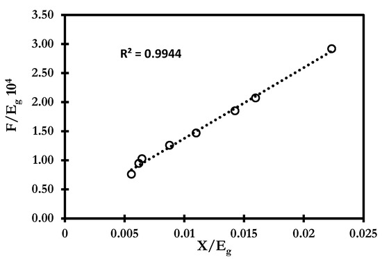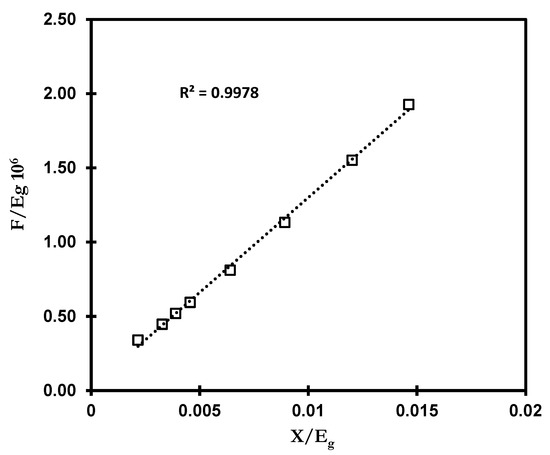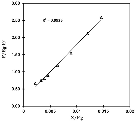- Plot (F/Eg) vs. (X/Eg). Based on Equation (28), the plot is a straight-line relationship with a slope of free gas volume of organic matrix (Gforg), and an intercept of the free gas volume of the inorganic matrix (Ginorg);