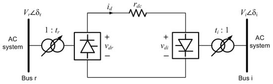 The rectifier converter is connected to AC bus r through the converter transformer at one end of the HVDC line. At the other end, the inverter is connected to AC bus i. The voltage at buses r and i are indicated by and , respectively. The tap ratio of converter transformers, connected at both ends of the HVDC line, are represented by and . The direct current flowing through the DC line is indicated by . and represent the DC link voltage at the rectifier and inverter end, respectively.