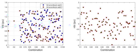 With the given set of CVs, as per Equation (8), certain observations related to the calculation of and DC link resistance, , are made to evolve the present mathematical model. For this, 100 different random combinations of , , and are generated, and the consequences are presented in Figure 3 for a DC link resistance of 0.05 pu.
