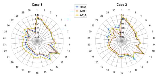 In Case 1 and Case 2, the OPF problem is solved to minimize the active power loss for the modified IEEE 30 bus systems. Altogether, 13 CVs are adjusted during the optimization, among which 2 CVs are related to the asynchronous tie. The best results for both cases are presented in Table 2. The optimized values of CV and a few important state variables are also mentioned in Table 2. The shaded portions in Table 2 represent the optimized values of the CV obtained and reported in various research works. It can be observed that under the optimized CV, the minimum power losses obtained with AOA are 11.47 MW and 11.0246 MW for Case 1 and Case 2, respectively. A comparison with other reported methods available in the literature reveals that AOA is able to optimize the real power loss by maximum value among all other methods. Moreover, to verify the feasibility of the obtained solution, the bus voltage magnitudes are plotted in Figure 6, showing that all bus voltages are within their permissible limits [,]. Moreover, the parametric analysis to select the tunable parameters is presented in Table 3. As mentioned in [], 24 different combinations are explored, and the optimum value of power loss for each combination is presented in Table 3. The values of 2, 6, 2, and 0.5 are found to be best for , , , and , respectively.