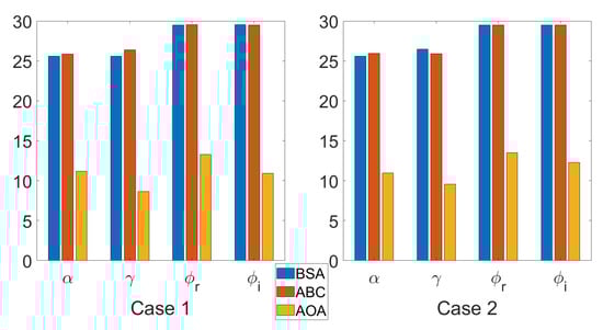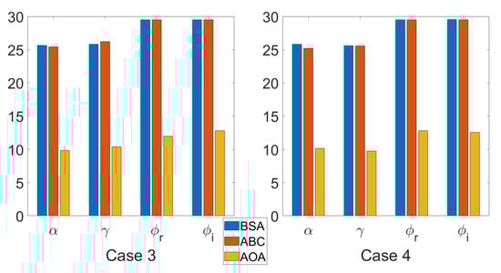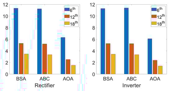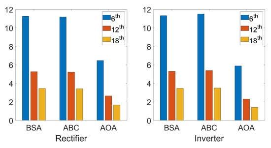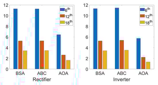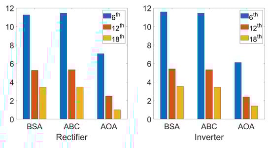 Furthermore, the harmonic components in the DC link voltage and AC currents were analyzed. The harmonics of the 6th, 12th, and 18th orders in the DC link voltage, as a percentage of the no-load maximum DC voltage, were evaluated for the results obtained through various optimization techniques and are plotted in Figure 8 and Figure 9. For all the orders of harmonics, a significant reduction can be observed in the case of AOA, which results from obtaining a lower value in the ignition delay and extinction advance angle with the proposed minimum CV. Similarly, the reduction factor for the harmonics of the 5th, 7th, 11th, and 13th orders of the AC current was evaluated and is presented in Table 4 and Table 5. The obtained results for AOA are better than BSA [] and ABC [], as the overlap angles obtained under the proposed OPF are the highest.