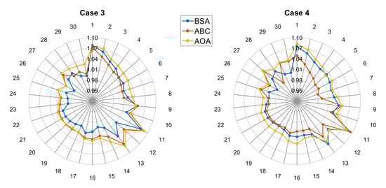 This section examines the applicability of the devised model in determining the DG allocation problem in hybrid AC-DC systems. In previous work [], three numbers of PV-type DGs were considered. Hence, here, in Case 3 and Case 4, the OPF is also solved to find the optimal location and size for three DGs, with the objective of real power loss minimization. In the problem formulation, two inequality constraints for each DG are added, and PV power is the added inequality constraint of the active power Equation (14). The best results obtained by AOA for both cases are tabulated in Table 8. Moreover, the values of all CVs and a few important state variables are presented in Table 8. The shaded portions in Table 8 represent the optimized values of the CV obtained and reported in various research works. The optimal locations of DGs in Case 3 are 5, 19, and 30, and in Case 4, the optimal locations are 5, 24, and 30. Moreover, the optimal size of all DGs is 10 MW by AOA, indicating the highest penetration of DGs. A comparison of the results with the methods reported in the recent literature is presented in Table 8. The best value of 8.5842 MW is obtained for real power loss in Case 3 using AOA, and it is better by 6.99% using BSA [] and 8.90% using ABC []. Similarly, the real power loss in Case 4 is 8.0435 MW, which is the lowest among all the methods. Compared to Cases 1 and 2, it can be observed that a considerable reduction in power loss in Cases 3 and 4 is achieved due to the optimal allocation of DGs. To show the feasibility of the solutions, the voltage magnitude of all buses in both cases is shown in Figure 10.