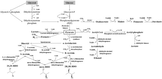 In bacterial metabolism, assorted monosaccharides (glucose, hexoses, pentoses) need to be converted to pyruvate in the first step. From glucose, pyruvate can be formed by the glycolysis pathway, while pentose needs an extra step involving pentose phosphate. The metabolic pathway of 2,3-BDO biosynthesis from glucose and glycerol is shown in Figure 2. Three key enzymes are required for the 2,3-BDO production from pyruvate, namely α-acetolactate synthase (ALS), α-acetolactate decarboxylase (α-ALD), and 2,3-BDO dehydrogenase or acetoin reductase (BDH, AR) []. Pyruvate is the key intermediate, which undergoes reduction or oxidation to produce several organic acids (lactate, formate, acetate, succinate), ethanol, and acetoin, depending on the pH value and oxygen content. To enhance the accumulation of 2,3-BDO and eliminate by-product formation during fermentation, genetic engineering and optimization of the fermentation parameters have been investigated []. Most microorganisms produce 2,3-BDO by three consecutive metabolic conversion steps: from pyruvate to α-acetolactate, from α-acetolactate to acetoin, and from acetoin to 2,3-BDO. First, pyruvate can be converted either into lactate, by employing L-/D-lactate dehydrogenase (LDH) and NADH, or into α-acetolactate via decarboxylation by ALS. Furthermore, α-acetolactate can spontaneously transform into diacetyl by decarboxylation with the existence of oxygen. The diacetyl can subsequently be converted into acetoin by employing the reducing power of NADH and diacetyl reductase (DAR). Otherwise, α-acetolactate can be converted into acetoin by α-ALD without the presence of oxygen. Finally, acetoin can be converted into 2,3-BDO by BDH. It is noteworthy that, as an intermediate compound prior to the formation of 2,3-BDO, acetoin would be obtained by the reversible metabolic conversion from 2,3-BDO. It has been reported that low pH is an effective inducer for all the vital enzymes, α-ALD, ALS, and BDH, resulting in the enhanced biosynthesis of 2,3-BDO [,].