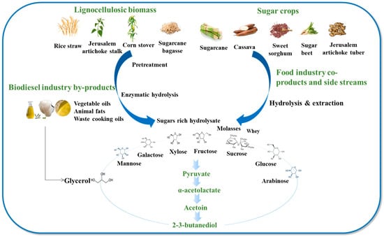 Although massive progress in metabolic engineering has been made to increase the efficiency of 2,3-BDO production, its microbial production from refined sugars has not been economically feasible []. The cost of commercial refined sugars exceeded 30% of the total cost []. Cheaply available and abundant substrates such as hydrolysates of starch, corn cob, Jerusalem artichoke, whey permeate, molasses, and crude glycerol derived from the biodiesel industry have attracted great interest for 2,3-BDO production (Figure 3) []. Generally, these feedstocks can be classified as lignocellulose biomass, food industry side streams, and by-products from the biofuel industry. Normally, the production of 2,3-BDO from lignocellulosic biomass includes three essential processes: (1) pretreatment of the biomass to break up interactions between the polymeric components and cellulose to make them more accessible for the upcoming step, commonly known as enzymatic hydrolysis or saccharification; (2) employing hydrolases like cellulases, xylanases, and other carbohydrases to hydrolyze the pre-treated biomass; and (3) fermentation of monosaccharides to produce 2,3-BDO. It is generally agreed that the effectiveness of pretreatment and enzymatic hydrolysis are the decisive factors determining the efficiency of 2,3-BDO production.