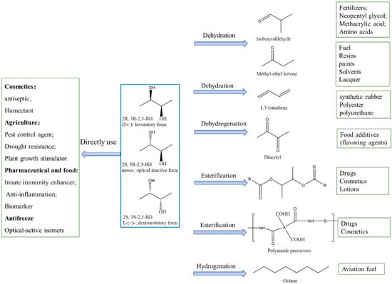 Moreover, pure meso-2,3-BDO or (2R,3R)-2,3-BDO can be synthesized by Bacillus licheniformis MW3 (ΔbudC). Ge et al. developed a process that included the screening, analysis, mutation, and evaluation of chiral 2,3-BDO production []. Li et al. attempted to synthesize pure (2R,3R)-2,3-BDO by E. cloacae via deletion of the bdh, ldh, and frdA genes to block by-production formation. The engineered strain produced 152 g/L (2R,3R)-2,3-BDO with 3.5 g/L/h productivity []. Obliteration of the dudA gene in P. polymyxa ZJ-9 resulted in the production of (2R,3R)-2,3-BDO at 25.88 g/L with a 99% purity in fed-batch cultivation []. Then, the enhancement of (2R,3R)-2,3-BDO production to 111 g/L by P. polymyxa DSM 365 was achieved []. Thus, P. polymyxa is an efficient producer for (2R,3R)-2,3-BDO production.