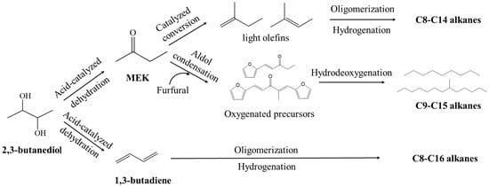 - Cui, X.K.; Zhao, X.B.; Liu, D.H. A novel route for the flexible preparation of hydrocarbon jet fuels from biomass-based platform chemicals: A case of using furfural and 2,3-butanediol as feedstocks. Green Chem. 2018, 20, 2018–2026. [Google Scholar] [CrossRef]
