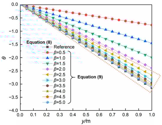 The degree of convergence between Equations (8) and (9) for different values of β based on the objective θ. Within the range marked by the dotted lines, β = 3.5 K−1 is chosen based on the structural dimensions and environmental conditions hereafter in the settings.