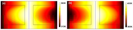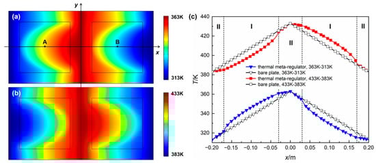 Additionally, the above settings are set to specifically show the special control effect on the thermal field directed by the concept of the designed thermal meta-regulator. This concept is universal; different math values of the threshold as well as ambient temperature may lead to different derivation results from the mathematical model, but the essential function and characteristics of the structure will not be affected. When further exploring the potential applications of the designed thermal meta-regulator, we can decide the temperature threshold value according to the actual environmental conditions or requirements at that time and still obtain a similar thermal response. For example, Figure 4 shows temperature distributions of the thermal meta-regulator model at Tc = 373 K and temperature settings of the hot end/cold ends are 363 K–313 K and 433 K–383 K. Obviously, the structure still exhibits essentially the same functions and characteristics as described above with the new threshold value and correspondingly different environmental conditions.