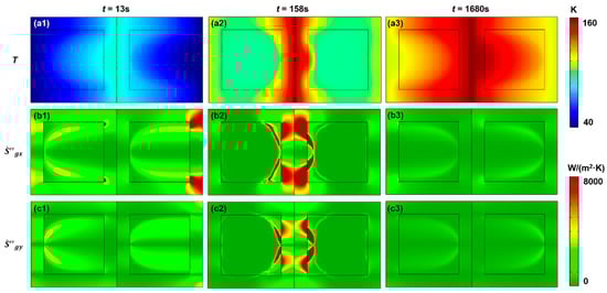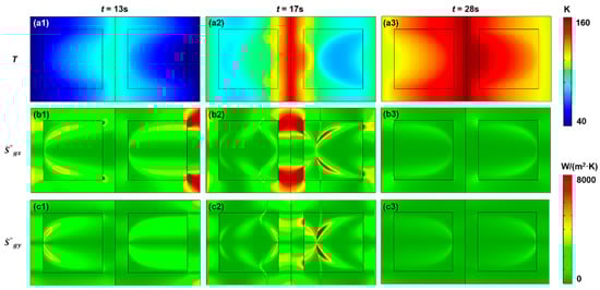 Different distributions of the thermal meta-regulator model containing latent heat at different times: (a1–a3) temperature and (b1–c3) the local entropy production rate components. Other settings remain the same as in Figure 5.