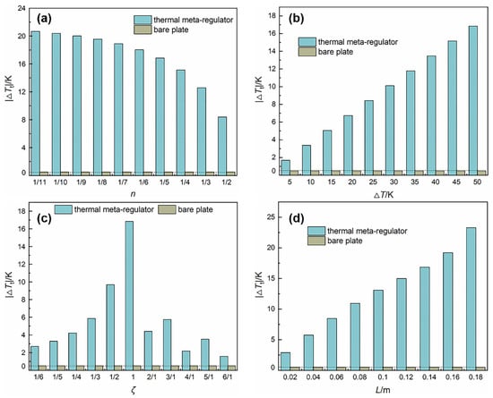 In all cases in Figure 7, |△Tt| is always equal to 0 in the bare plate model, independent of the variation of the four independent variables, but possesses much higher value in the thermal meta-regulator model, indicating that all design schemes of the thermal meta-regulator model are effective. For the thermal meta-regulator model, the increase in the spatial distortion degree in the functional regions based on the decreasing compression ratio n will lead to a stronger regulation of the thermal field, so the smaller n leads to the larger |△Tt|. The change in the boundary temperature difference △T (including that in Figure 8 below) comes from fixing the hot-end temperature and then adjusting the cold-end temperature. The almost linear positive correlation between |△Tt| and △T suggests that the thermal meta-regulator model has greater application potential in environments with greater variability. The cycle parameter ζ denotes the repeatability of temperature profile shape in the functional regions. Referring to the initial scheme with ζ = 1, ζ values less than 1 imply a consistent but smaller amplitude of the thermal distribution trend, indicating the declined control degree of the thermal field in functional regions, so it is logical that |△Tt| falls with the decreasing ζ when ζ < 1. Instead, multiple identical heat distribution shapes are repeated in the functional regions when ζ > 1; the larger the ζ value, the higher the repetition frequency. Under this circumstance, locations of heat accumulation or dispersion will no longer be fixed and will gradually extend to the entire functional regions as the repetition frequency increases. As a result, |△Tt| drops significantly once ζ exceeds 1 and, although |△Tt| rises to some extent when ζ becomes an odd integer, it falls more violently as ζ increases to the next even integer, illustrating that the effect of the thermal meta-regulator model is relatively unsatisfactory in all scenarios where ζ > 1. As for the side length L, the larger L represents the larger area occupied by the functional regions, so the thermal energy will be further away from or closer to the center of the functional regions under the action of the thermal meta-regulator model. Hence, the larger L is, the stronger the thermal field control ability of the thermal meta-regulator.
