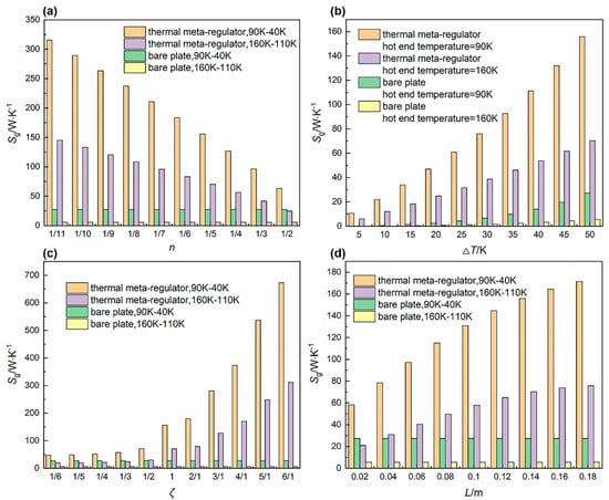Figure 8 shows the effect of each design variable on total entropy production in two models. Here, we analyze the correlations between total entropy production and different design variables under both high and low environmental conditions. Overall, the changing pattern of with each variable is consistent for different temperature environments, but the value in hot ambient is always lower than in cold ambient, which should be attributed to the lower local entropy production resulted from larger temperature values at spatial points in high-temperature environments for the same input energy. Then, for the bare plate model reflecting the traditional materials, the functional regions do not exist (let alone the spatial distortions and the peculiar distribution of thermal energy), so the parameters n, ζ, and L do not affect the thermo-dynamic characteristics of the bare plate system. However, for the thermal meta-regulator model, the growing n value causes the reduction in the spatial compression of the functional regions and subsequent energy fluctuations within the entire system, so decreases exponentially with the increase in n. Furthermore, the increase in input thermal energy will intensify the rearrangement of the thermal field by the thermal meta-regulator model, so the increase in the boundary temperature difference △T will lead to an exponential growth in . It should be noted that, during the gradual increase in △T, the total entropy production of the bare plate model also promotes exponentially rather than remaining constant, which can be inferred from the definition of the entropy concept as well as the increased energy and decreased temperature at most locations within the domain due to the increase in △T. Under the definition of repeatability of the temperature profile shape in the functional regions, ζ directly characterizes the spatial distortion degree in the functional regions; higher ζ values necessarily induce more energy disturbances and monotonic growth of in the thermal meta-regulator model. In addition, the area expansion of the functional regions also leads to the broadening of the spatial deformation scope of the whole system, so that increases with the increase in the side length L of functional regions, although this increasing trend deteriorates as L approaches the dimensionality of the background space.