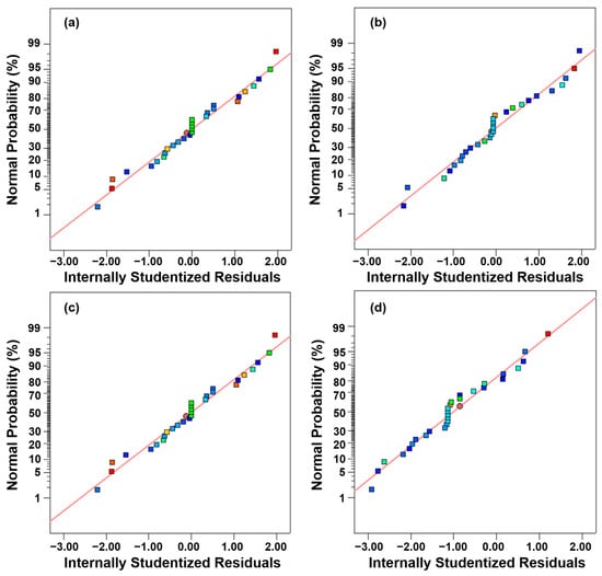 Normal probability of internally studentized residuals for |△Tt|0.2 and |△|0.2 in different environments. Maps (a–d) are from regression equation Equation (14) and Equation (17), respectively. The concentrations of internally studentized residuals around the diagonals indicate that the regression models obtained are reasonably valid.