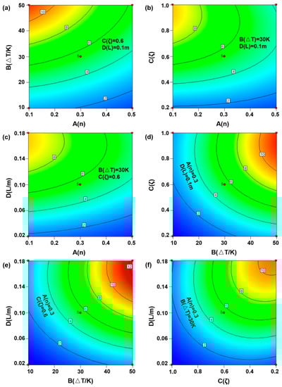 Contour plots of interactions between each two variables within the significant items on |△Tt|0.2: (a) interactions between n and △T; (b) interactions between n and ζ; (c) interactions between n and L; (d) interactions between △T and ζ; (e) interactions between △T and L; (f) interactions between ζ and L. The laws of action are applicable to both high and low temperature environments (Tr > Tc and Tr < Tc). Numbers in squares on the contour lines represent the promotion of the interaction between factors on the target value, the larger the number, the higher the target value.