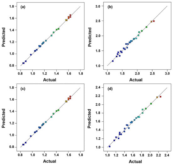 Relationships between the predicted and the actual values of each target parameter in different environments. Maps (a–d) are from regression equation Equations (14)–(17), respectively. Colorful squares represent residuals and the high concentration of data near the diagonal means that the obtained regression equations have good predictability.