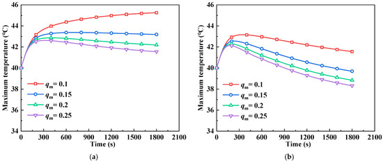 Specifically, as shown in Figure 9a, when the flow temperature is 25 °C and the mass flow rate is 0.1 kg/s, the maximum temperature of the battery will continue to rise slowly. This indicates that the LC system does not suppress the sustained heating of the battery pack, and that the cooling capacity needs to be enhanced at this time. However, when the mass flow rate reaches 0.15 kg/s, 0.2 kg/s, or 0.25 kg/s, the maximum temperature of the battery pack will decrease continuously after a brief rise. This means that the performance of the LC system is sufficient. The latter trend can also be summarized from Figure 9b–d. In addition, the comparative results between the maximum temperature of the battery pack at the terminal of 2C discharge and the initial temperature of 40 °C are listed in Table 3. They show that some combinations of mass flow rate and temperature can reduce the maximum temperature of the battery pack below the ambient temperature. At 25 °C and 0.1 kg/s inlet flow, the maximum temperature of the battery pack is 5.26 °C higher than the ambient temperature; while at 10 °C and 0.25 kg/s inlet flow, it is 4.46 °C lower. It is worth noting that the reduction in the maximum temperature of the battery slows down to around 36 °C owing to some heat being released during the solidification process of the PCM. This offsets some of the cooling capacity of the LC system. In general, by adjusting the flow temperature and mass flow rate of coolant, the performance of the LC system can be improved and the maximum temperature of the battery is significantly reduced.