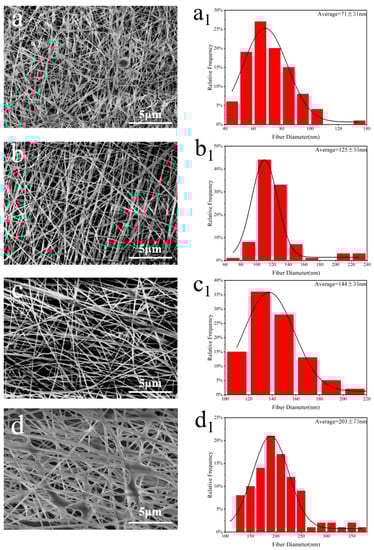 SEM images and diameter distribution of electrospun nanofibers produced from SA/PEO blend solution at different concentrations: (a,a1) 2 wt%, (b,b1) 3 wt%, (c,c1) 4 wt%, and (d,d1) 5 wt%.