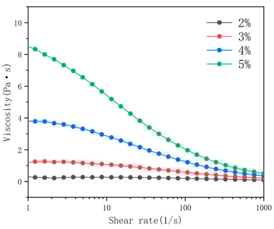 The viscosity of spinning solutions with concentrations of 2 wt%, 3 wt%, 4 wt%, and 5 wt% at different shear rates.