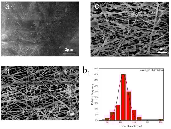 SEM images and diameter distribution of electrospun nanofibers produced from SA/PEO blend solution at different voltage: (a) 20 kV; (b,b1) 25 kV; (c) 35 kV.