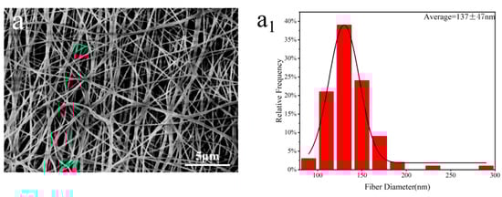 SEM images (a) and diameter distribution (a1) of electrospun nanofibers produced from SA/PEO blend solutions with TCD of 20 cm.