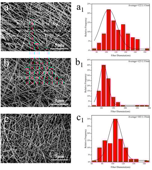 SEM images and diameter distribution of electrospun nanofibers prepared from SA/PEO blend solution at different mass ratios: (a,a1) 20:80; (b,b1) 30:70; and (c,c1) 40:60.