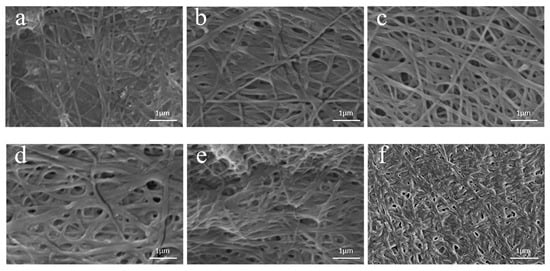 SEM images of cross-linked membranes at different time: (a) 1 min; (b) 3 min; (c) 5 min; (d) 7 min; (e) 15 min; and (f) 20 min.