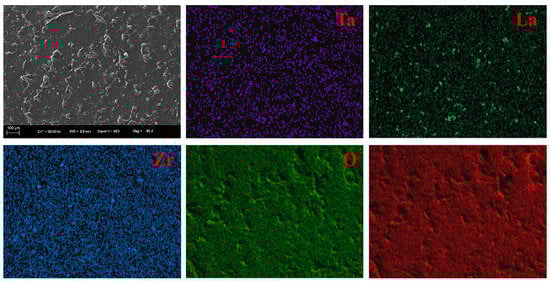 The morphology of the nanofiber membranes cross-linked at different times was characterized, as shown in Figure 7. As the crosslinking time increased, the degree of Ca2+ crosslink gradually increased; at the same time, the swelling of fibers caused the pores between fibers to become smaller. The existence of fiber pores was beneficial for the subsequent preparation of electrolytes. From the figure, it could be seen that when the crosslinking time did not exceed 7 min, the fiber pores remained good. The surface morphology of the solid electrolytes was observed by scanning electron microscope. The dispersion of ceramic particles was a key factor influencing the function of electrolytes. When LLZTO ceramic particles were led into the PEO matrix, the electrolyte film had a positive morphology, and the ceramic particles were regularly distributed in the PEO matrix. It has been known that EDS mapping is a good characterization method for detecting the distribution status of elements in samples [26]. The surface EDS mapping (Figure 8) of the electrolyte showed a uniform distribution of elements C, O, La, Zr, and Ta, further indicating the regular dispersion of ceramic particles in the PEO matrix, which helped to avoid micro short circuits within the battery.